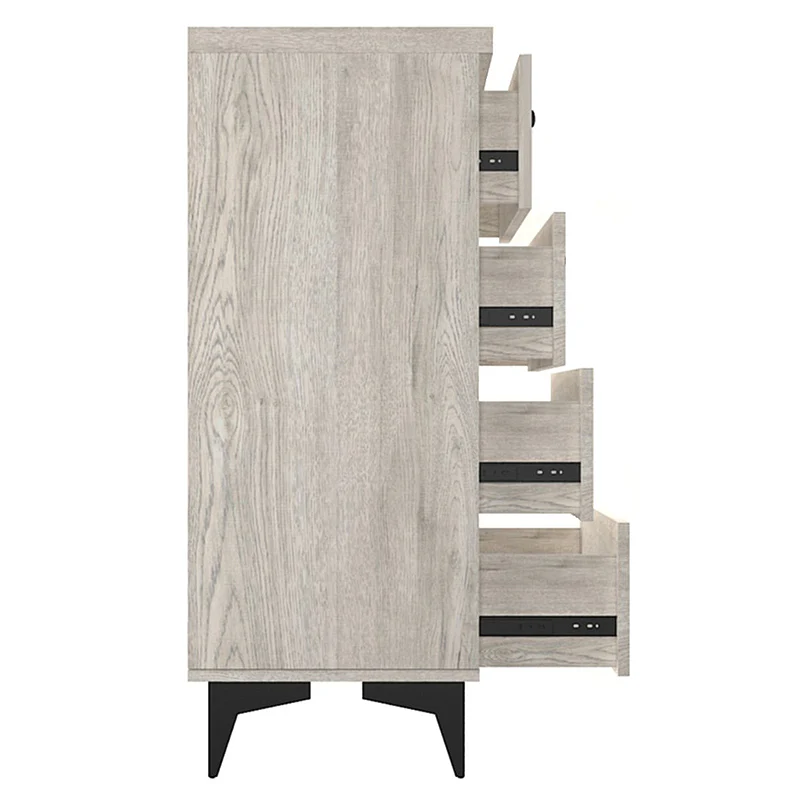The Bayville 4 drawer chest offers a modern design that will compliment any home interior. Featuring 4 x full size drawers on high quality full extension glider runners, it provides sufficient storage for all your personal belongings. The 3D grey wash wood-look laminated finish and sturdy powder coated black metal legs provides an industrial yet contemporary look to your home interior. This item will give your living space a fresh make over with its unique style and sturdy feel.