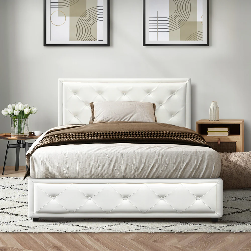 The Enzo Gas Lift Bed White PU Leather is a sleek, contemporary statement designed to elevate your bedroom with its premium PU leather upholstery and refined finish.