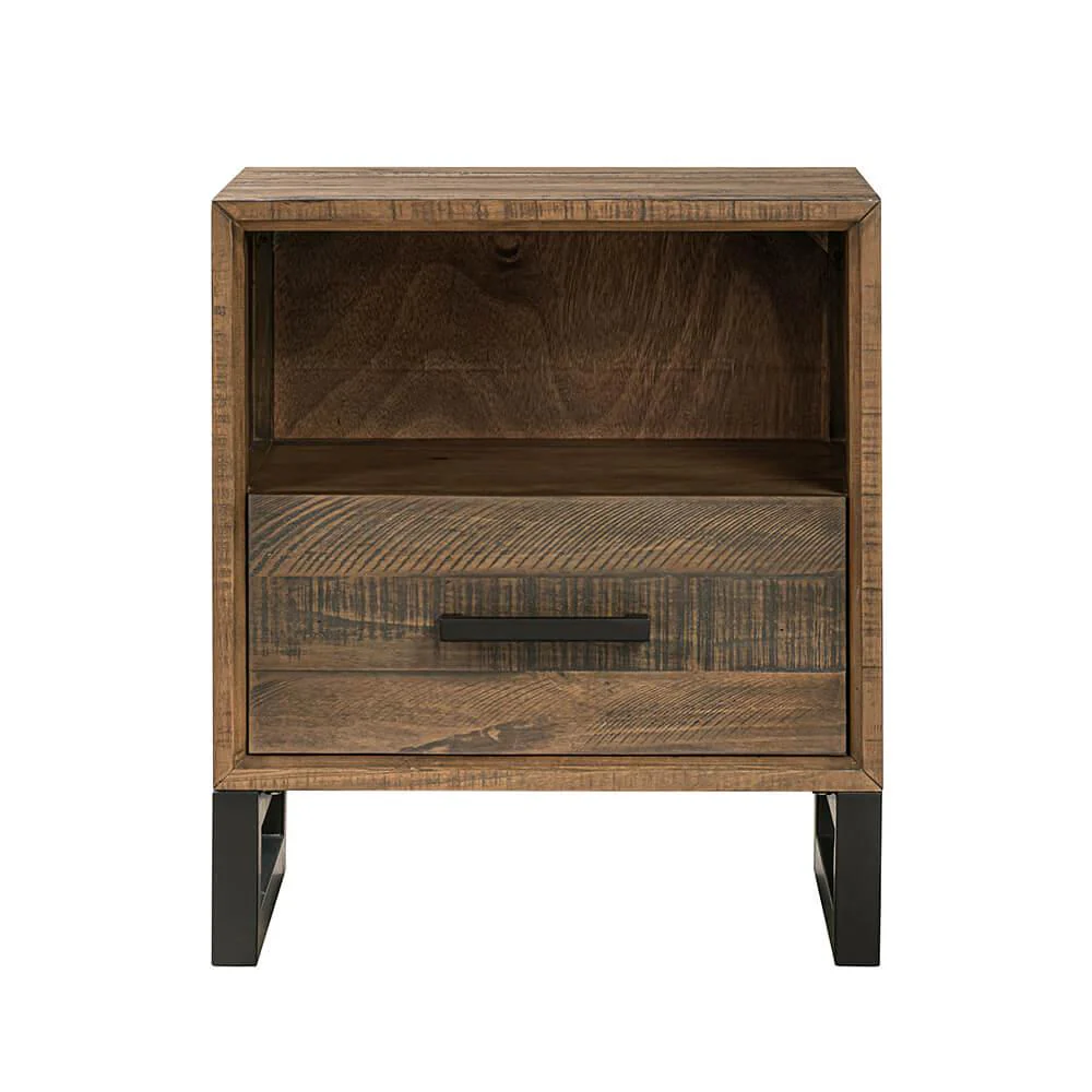 The Reklaim bedside table features French Broad stain Recycled Pine and Metal. Its handcrafted and made from reclaimed and recycled timber giving a strong corner bracing and meta centre rail! This beautiful bedside is a master piece! Why not complete the range with Reklaim Bookcase Bed Frame as well as a 4 drawer chest to give your bedroom a sleek look?