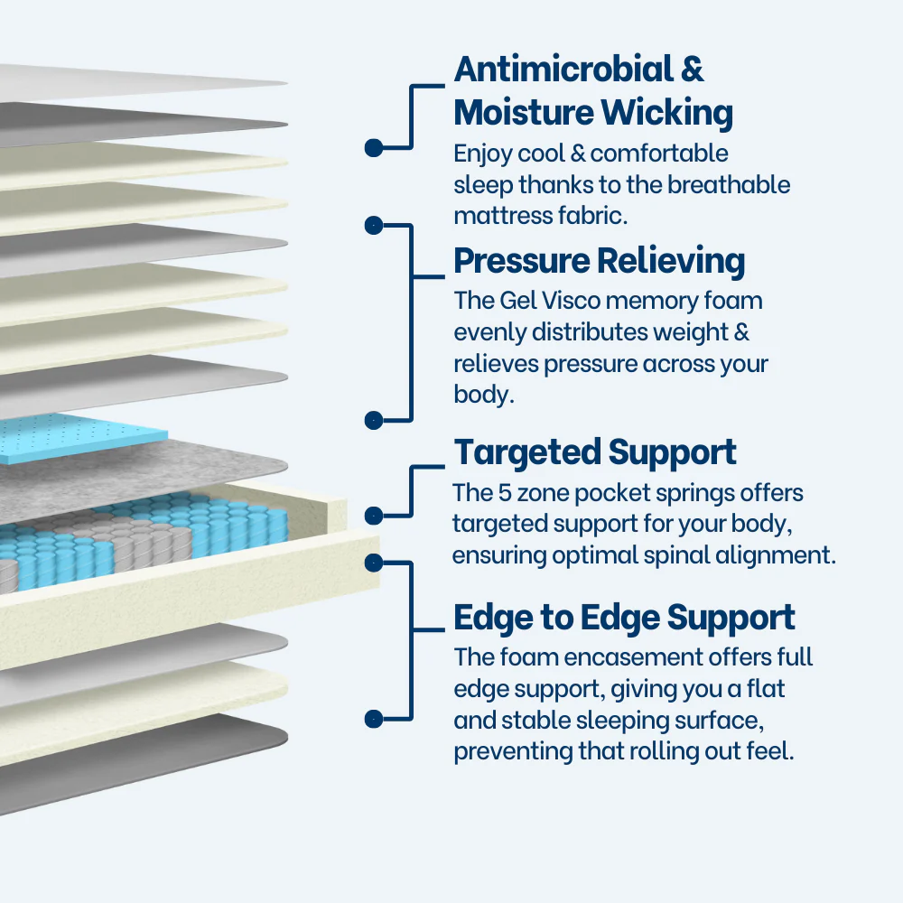 Experience ultimate comfort & support with the Revivify Support Long Single Mattress! Featuring 5 Zone Full Foam Encased Pocket Springs for optimal spinal alignment and motion isolation. The Gel Visco Memory Foam Lumbar Support targets back relief, while Foam Comfort Layers provide a perfect balance of softness and support. Finished with AG+ Silver Ion Fabric for freshness, and packaged in eco-friendly Recycled Cardboard Bed in a Box for easy transport. Upgrade your sleep today!